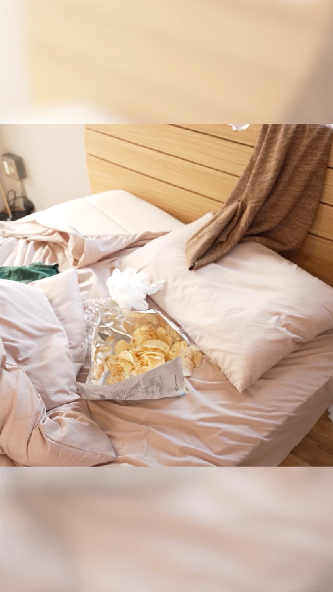 ベッドの上、お菓子などが散乱