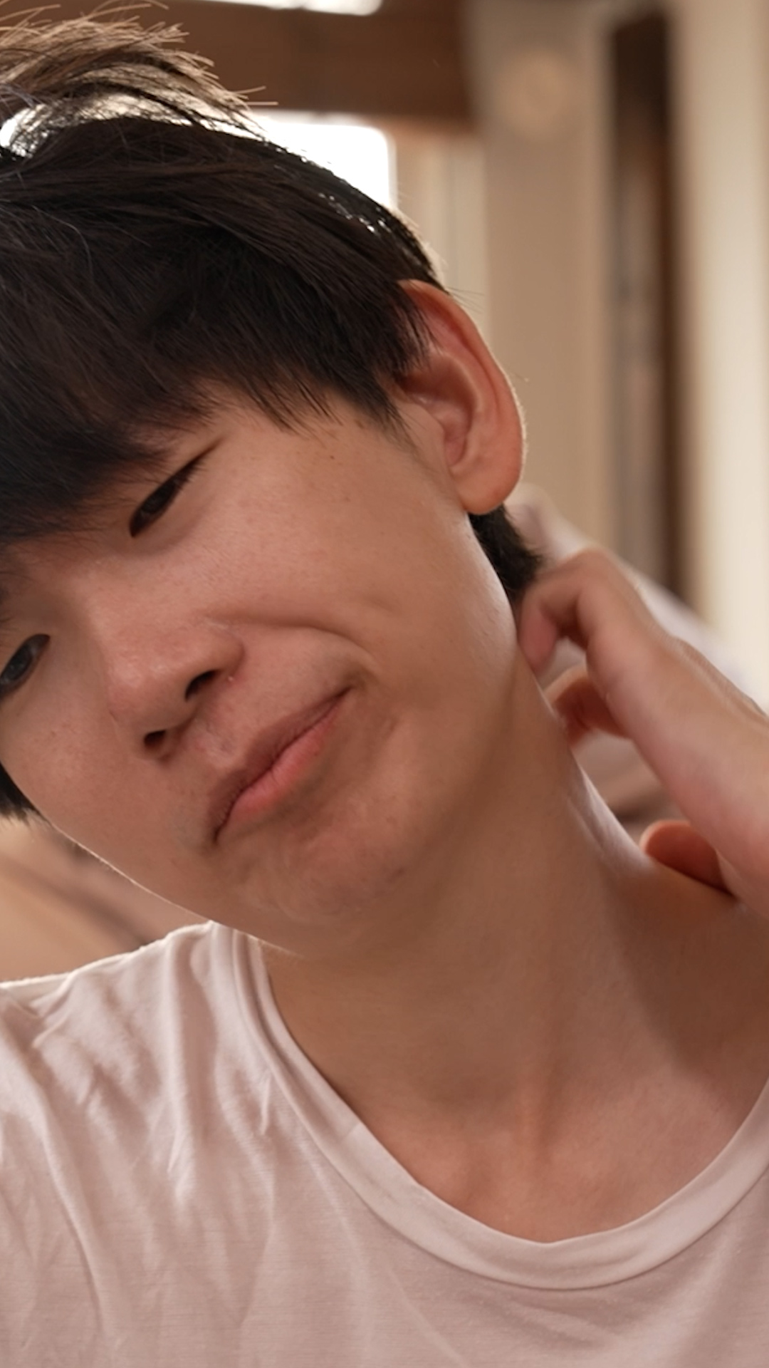 携帯触るご主人のアップ、かゆみ、くしゃみ