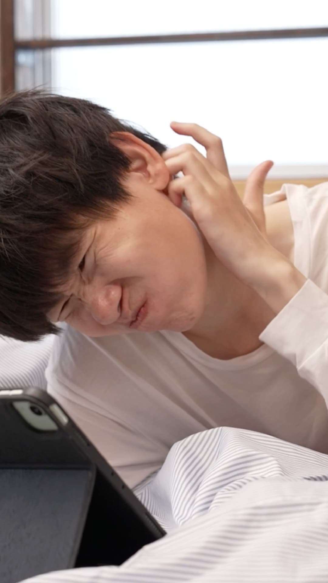 ベッドの上でポテトを食べてくつろぎご主人首をかく